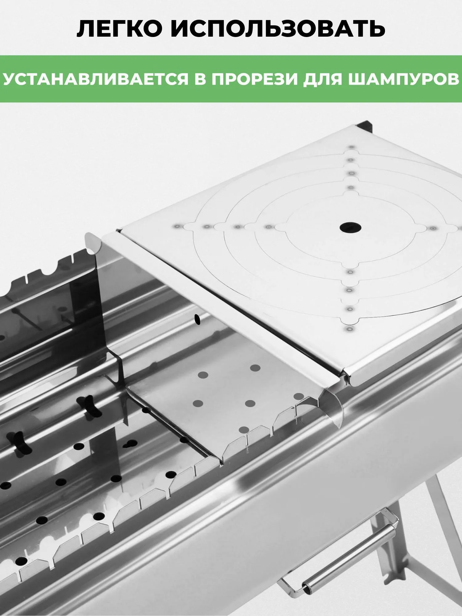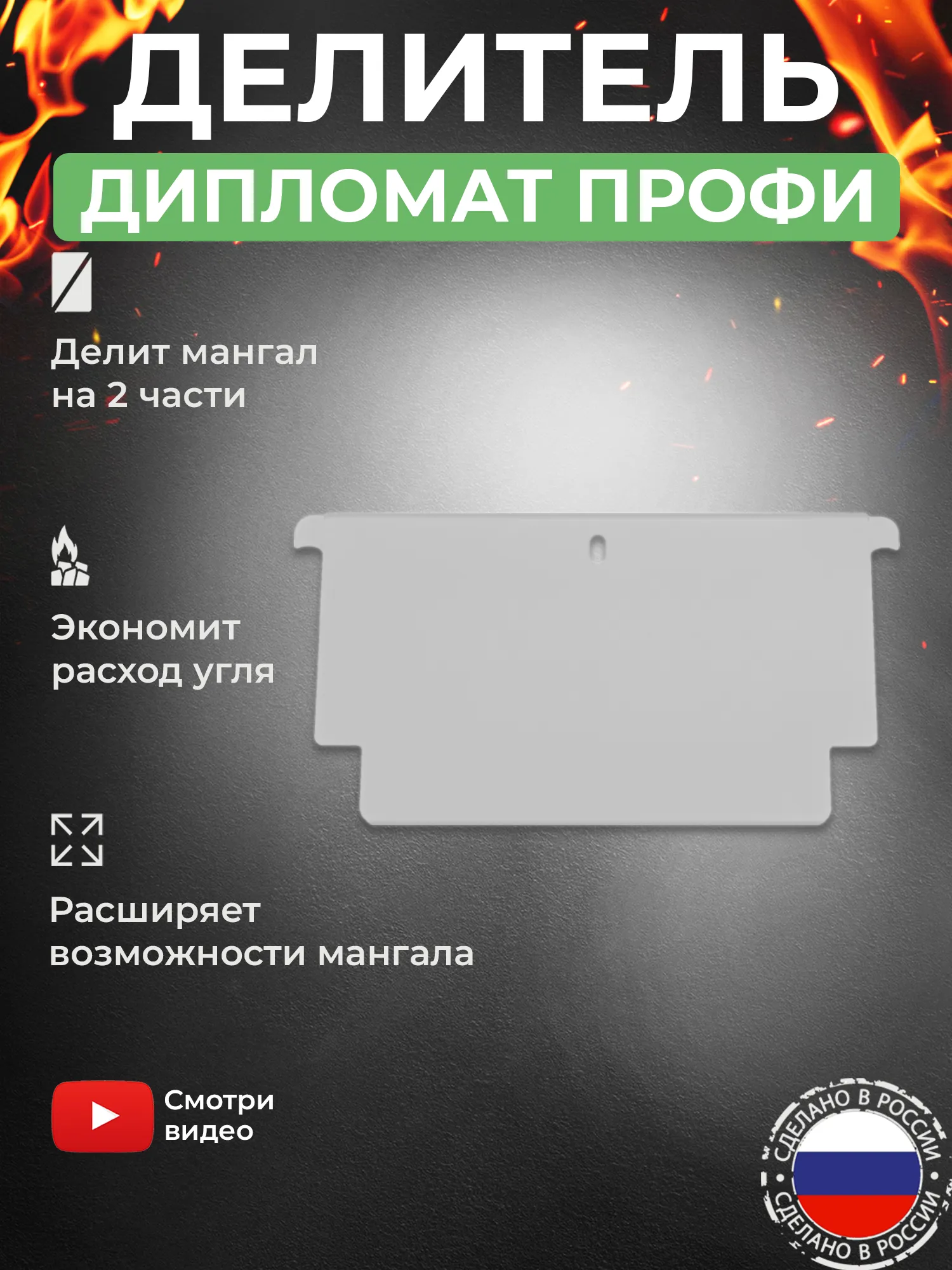 Аксессуар изготовлен из высококачественной нержавеющей стали. С таким делителем существенно расширяются возможности мангала «Дипломат Профи», превращая его в многофункциональный инструмент полевой кухни с возможностью создавать в мангале зоны с разной температурой.