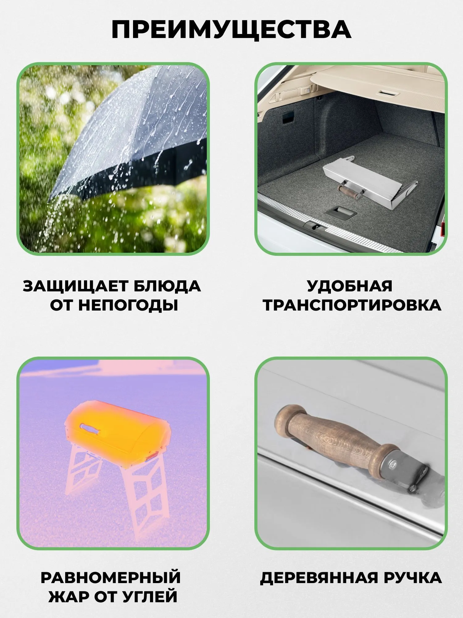 Одним из главных преимуществ складной крышки для мангала перед аналогами является ее универсальность и компактность. В сложенном виде ее удобно хранить и перевозить в багажнике вашего авто. Крышка также может использоваться в любую погоду, даже в случае дождя, обеспечивая надежную защиту продуктов от влаги. Это позволяет провести пикник на природе без ущерба для качества приготовленных блюд.