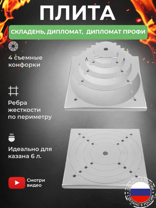 Плита из нержавеющей стали со съемными конфорками разного диаметра предназначена для использования на мангалах с шириной жаровни 30 см. С данным аксессуаром мангал можно эксплуатировать как полноценную плиту для готовки блюд в кастрюле или на сковороде, а также как подказанник для установки небольшого казана. Убрав несколько сегментов можно установить на плиту чугунный горшочек, а если убрать все кольца, то отлично встанет казан на 6-8 л.