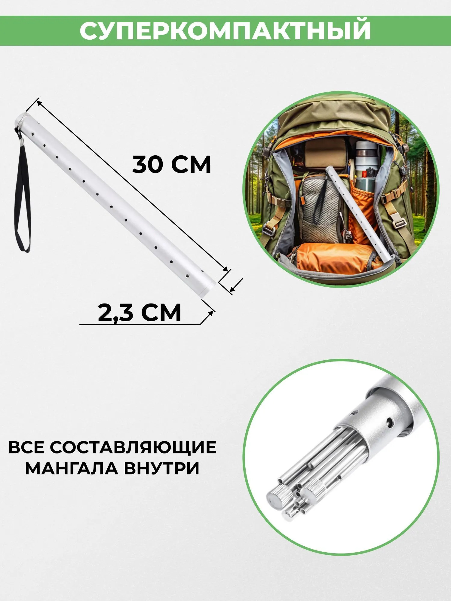 По сравнению с традиционными, Grilliput до разжигания костра практически незаметен. В сложенном виде его можно носить в кармане! В таком состоянии сверхкомпактный мангал представляет собой небольшой цилиндр с отверстиями, внутри которого разместился еще один и все остальные составляющие ‒ ножки, спицы.