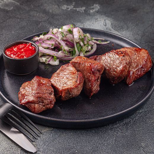 Нарезка стейками по 4 см даёт плотный, но нежный шашлык с выразительной текстурой. Оптимальное время приготовления — 16–18 минут. Внутри мясо остаётся слегка розовым, снаружи — румяным и ароматным. Такой шашлык хорошо воспринимается даже теми, кто обычно предпочитает говядину.