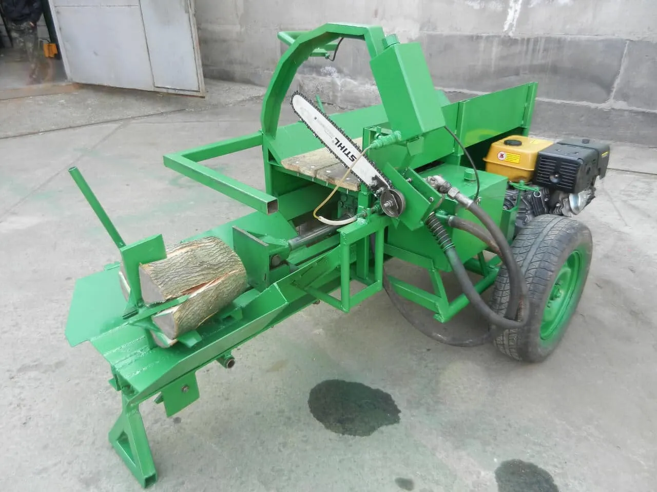 Еще одним вариантом дровокола, работающим, по сути, от двигателя, является гидравлический дровокол, подключаемый к гидравлической системе трактора. Он относительно прост в конструкции – за счет гидравлического воздействия толкатель идет вперед, раскалывая чурбак о статичный клин. Схемы таких дровоколов также можно найти в сети, но подойдут они далеко не всем, поскольку для их работы требуется наличие трактора.